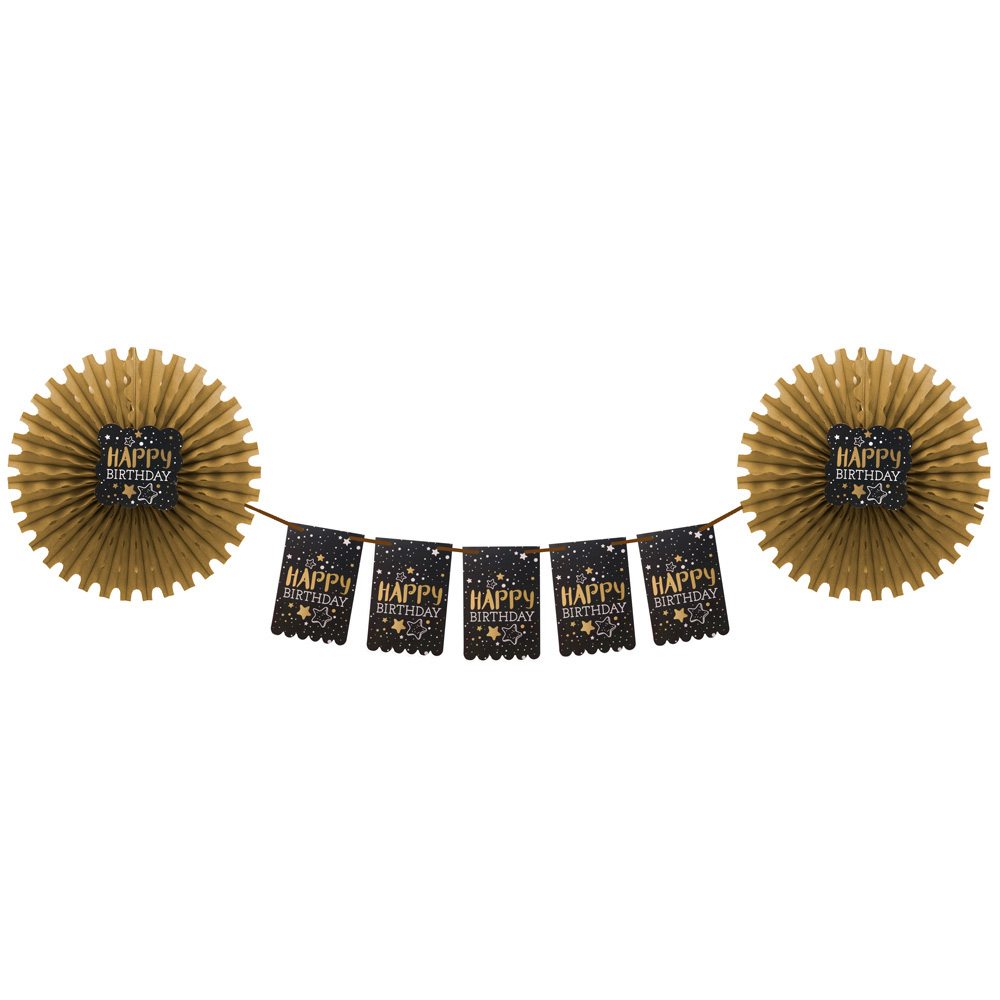 Happy Birthday altın yelpaze kağıt süs seti kağıt malzemeden üretilmektedir. Doğum günü partilerinde özel bir dekorasyon oluşturmak açısından tercih edilmektedir.