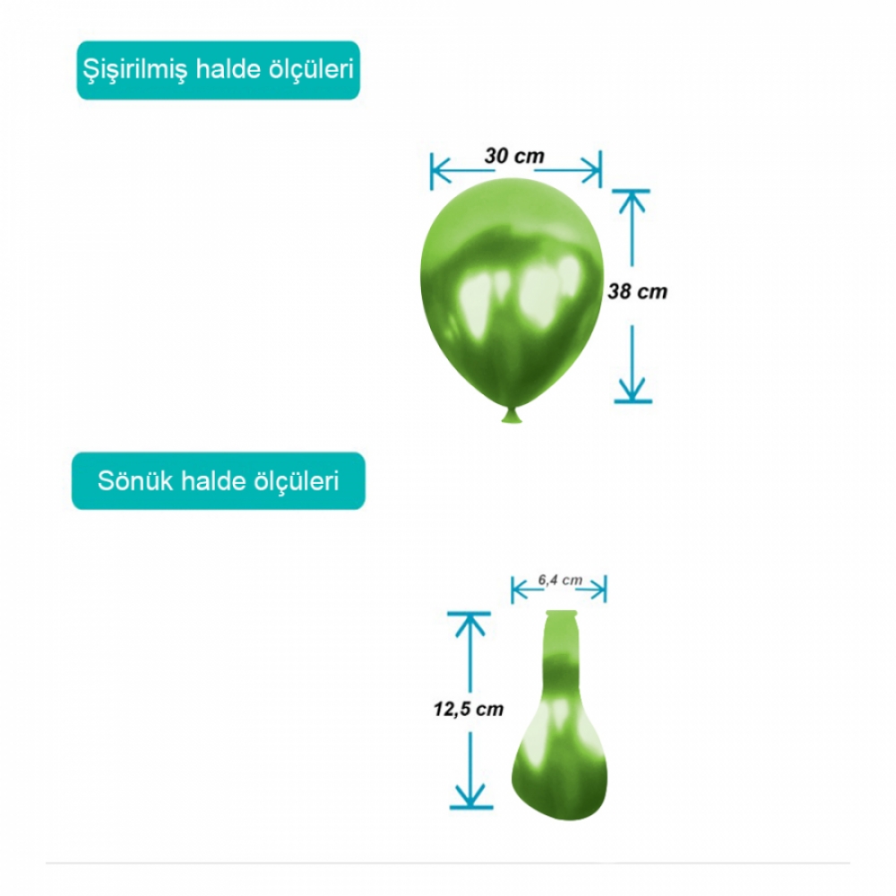 Harika renk tonu ve parlaklığı ile üretilen yeşil metalik balon tüm organizasyonlarda yer verebileceğiniz bir tasarımdır. Birçok farklı renk ile uyumlu olduğu için sevebileceğiniz diğer metalik balon renkleri ile bir arada kullanabilirsiniz.