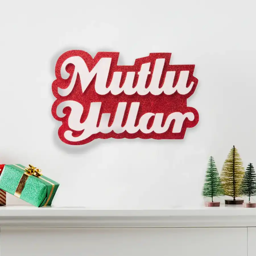 Beyaz "Mutlu yıllar" yazan model kırmızı renkte hazırlanmıştır. Yazı stili gölgelidir ve özel tasarımdır.
